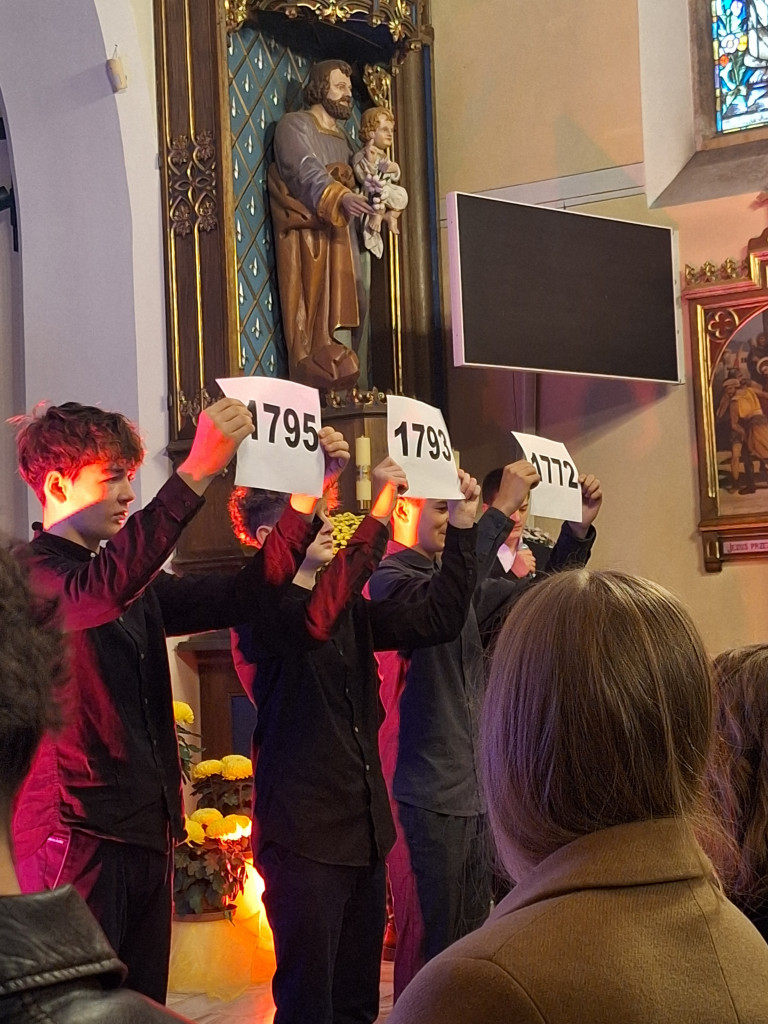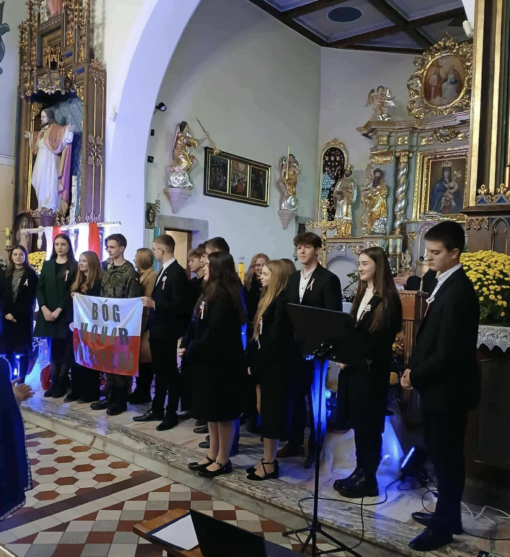 Po Mszy młodzież przedstawiła montaż słowno-muzyczny pokazujący dramat rozbiorów i trud walki o niepodległość. Na koniec umiłowaną Ojczyznę oraz naszą wolność powierzyliśmy opiece Bożej w śpiewie „Boże coś Polskę….”